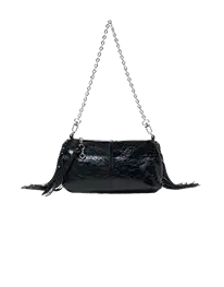 La iconica Miss M in versione pochette, al tempo stesso chic e pratica. Realizzata in pelle craquelé metallizzata, è dotata di una tracolla a catena argento rimovibile per essere portata a mano o a spalla.