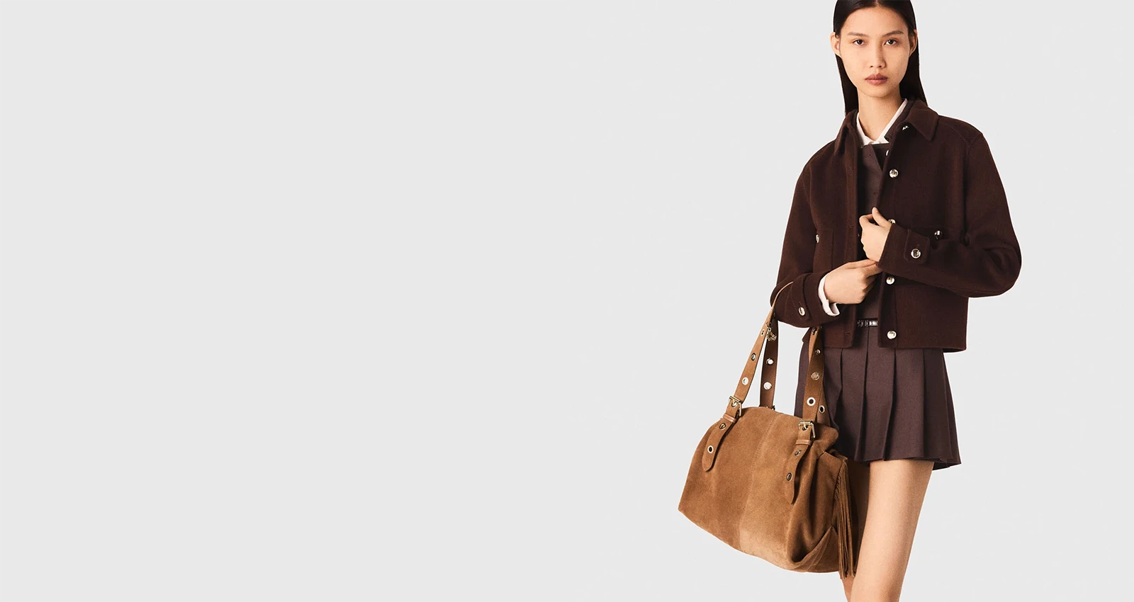 La Miss M di Maje rappresenta la borsa di una nuova generazione. Con la sua lunga tracolla ornata di occhielli e le sue generose fibbie a ogni estremità, la Miss M è la compagna trendy delle ragazze urbane. Scopri qui la versione originale della Miss M.